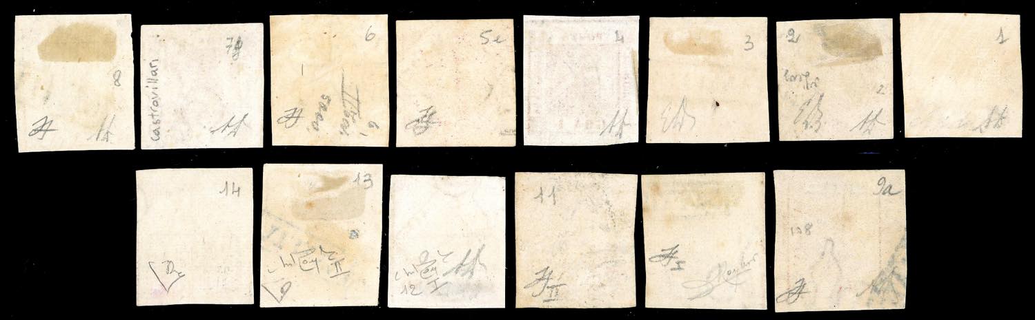 1858/59 - L'emissione completa di 14 esemplari, con tutte le tavole (1/14), usati, perfetti. Molto belli e di ottima qualità. Insieme raro. Tutti firmati e classificati da noti periti. I n. 12 e 13 cert. Raybaudi, il n. 14 cert. E.Diena.