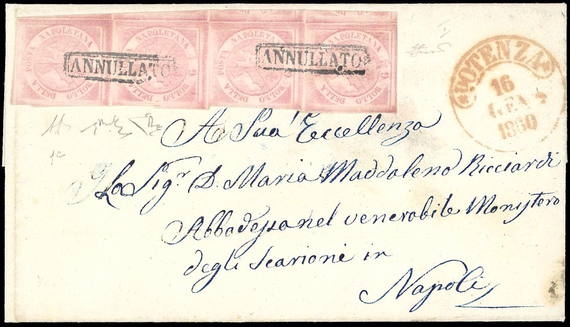 1860 - 1/2 grana rosa carminio chiaro (1c), striscia verticale di quattro esemplari, il primo con parziale filigrana "BT" gli altri tre senza filigrana, su fresca lettera da Potenza 16/1/1860 a Napoli. Splendida e rara. A. ed E.Diena, Chiavarello, cert. Ferrario. Ex coll. Imperato (cat.Sassone in proporzione € 16.500++).