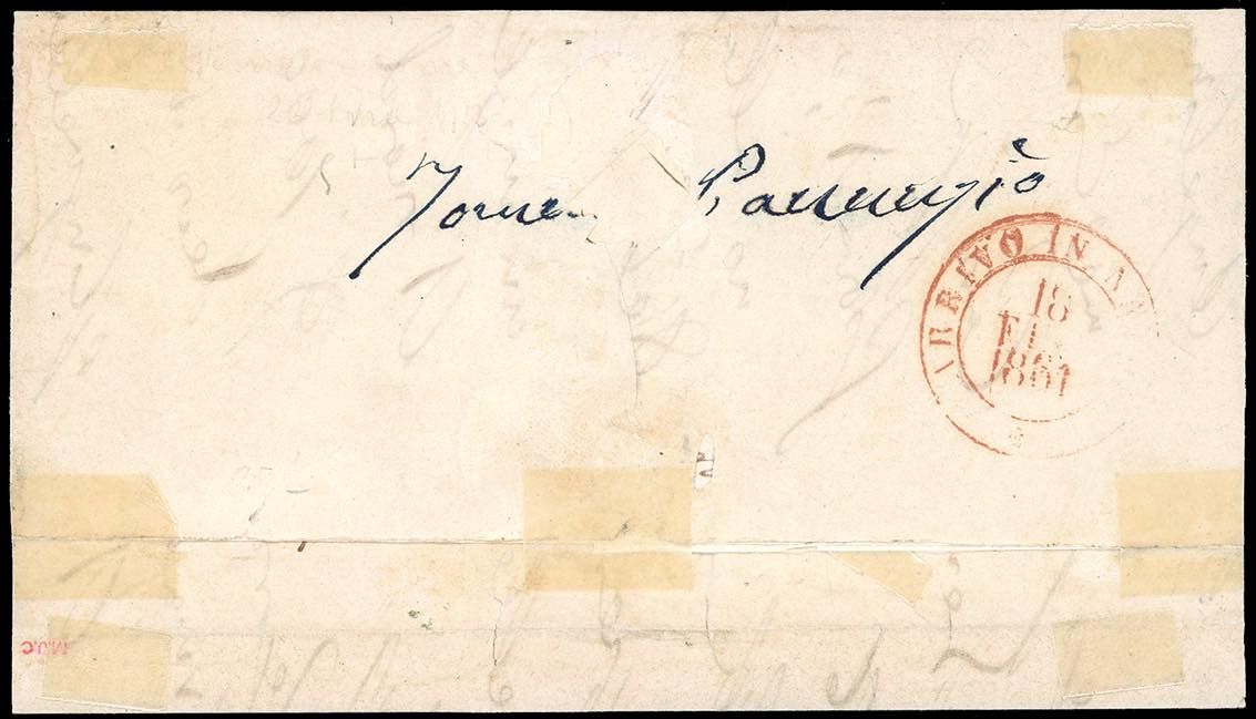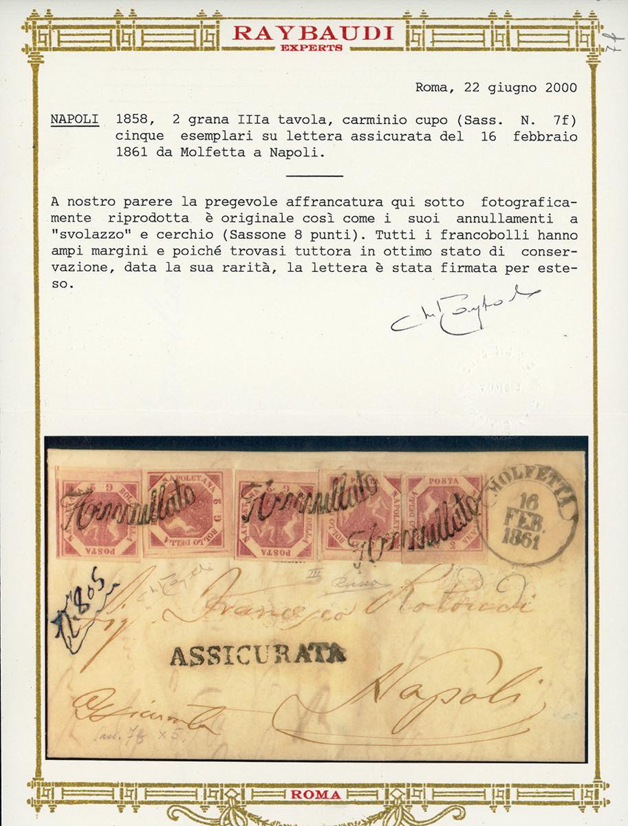 1861 - 2 grana carminio cupo, III tavola (7f), cinque esemplari, perfetti, su lettera assicurata (indirizzo parzialmente restaurato) da Molfetta 16/2/1861, annullo a svolazzo, a Napoli. Molto bella e rara. Russo, cert. Oro raybaudi (cat.Sassone € 25.000 + in proporzione).