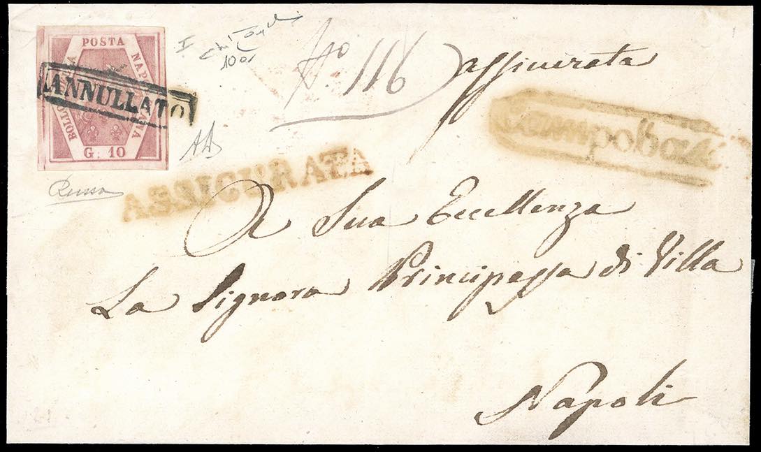 1859 - 10 grana rosa lillaceo, I tavola (10a), perfetto e ben marginato, su fresca lettera assicurata da Campobasso a Napoli 29/3/1858. ... Read more