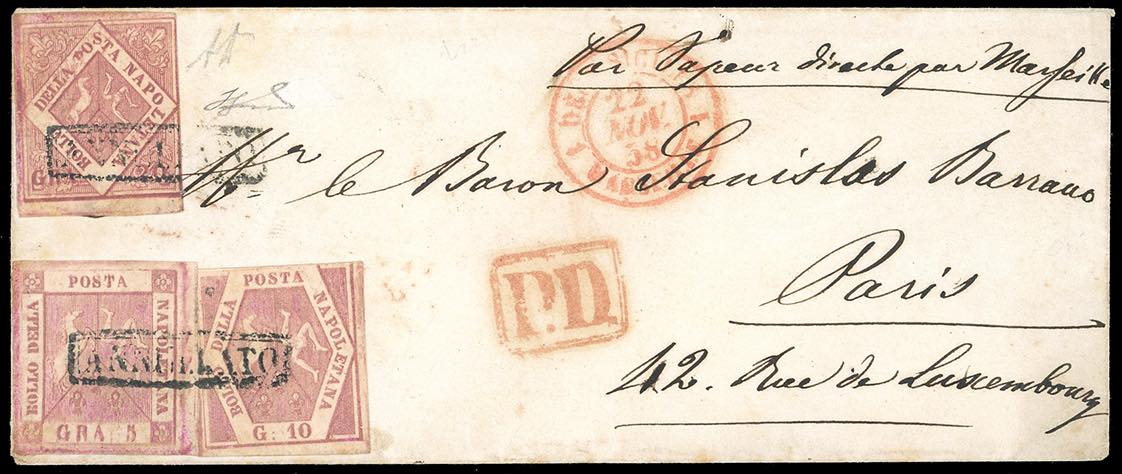 1858 - 20 grana rosa brunastro, 10 grana rosa brunastro, 5 grana rosa brunastro, tutti I tavola (12,10,8), ritoccati con pastello, su fresca lettera da Napoli 20/10/1858 a Parigi, in Francia. Da esaminare. A.Diena, Ferrario.