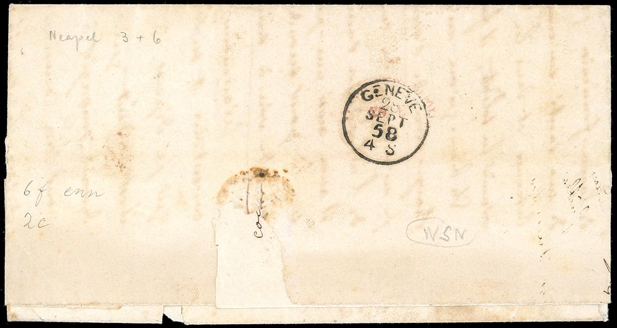 1858 - 20 grana rosa brunastro, I tavola, tre ottimi margini, leggermente intaccato in alto, 2 grana rosa carminio, I tavola, perfetto (12,5d), su busta da Napoli 25/9/1858 a Ginevra, in Svizzera, manoscritto sul fronte "via Marsiglia". Pregevole destinazione, di ottimo aspetto. Ex coll. Imperato.
