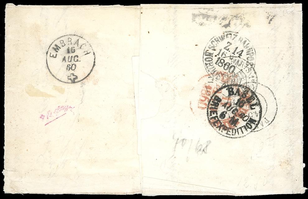 1860 - 20 grana rosa chiaro, II tavola, due esemplari, 2 grana III tavola, un esemplare rosa chiaro, riutilizzato in frode postale, ed uno carminio (13,7b,7d), buono/ottimo stato, su lettera di doppio porto da Napoli 11/8/1860 a Embrach, in Svizzera, per la via di Francia. Insieme molto raro. Chiavarello, cert. Ferrario. Ex coll. Imperato.