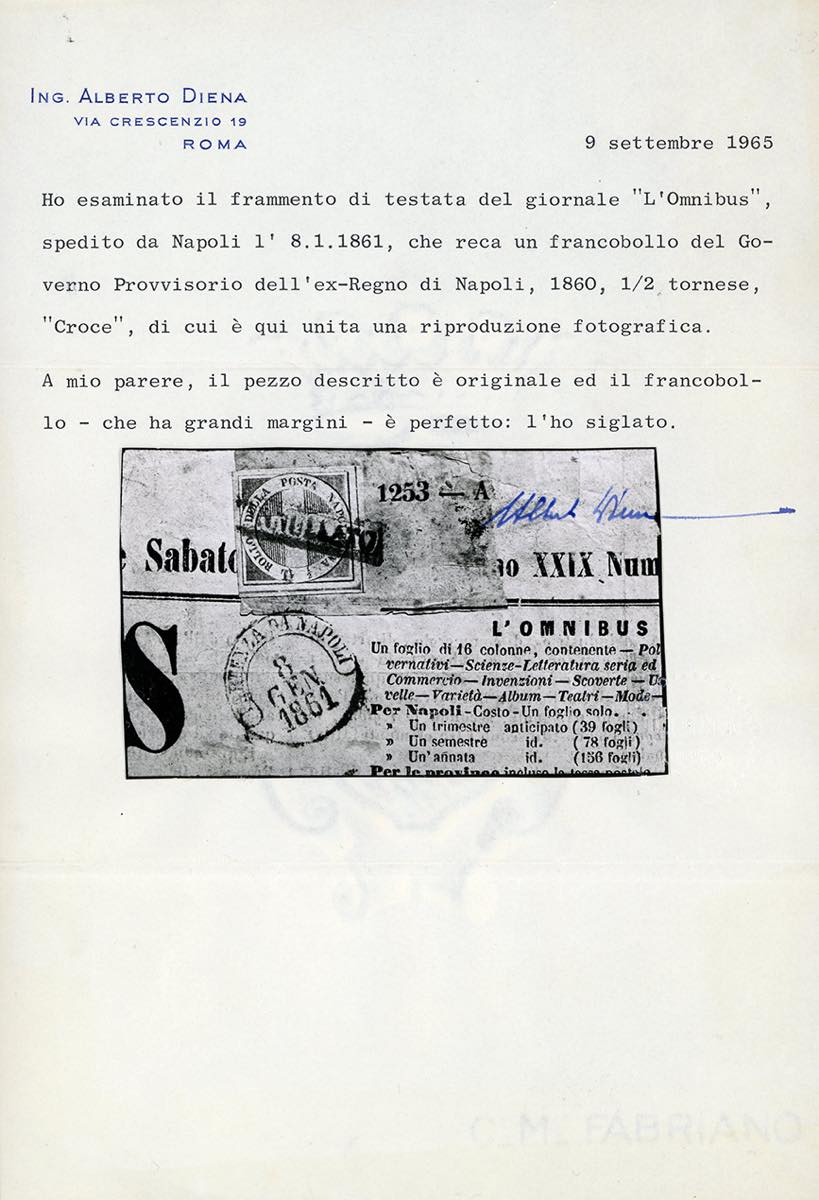1860 - 1/2 tornese azzurro Crocetta (16), perfetto, con ampi margini, usato su ampio frammento del giornale "L'Omnibus" spedito da Napoli 8/1/1861. Russo, cert. A.Diena.