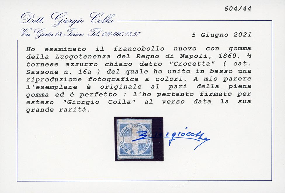 1860 - 1/2 tornese azzurro chiaro Crocetta (16a), nuovo, gomma originale, lieve traccia di linguella, perfetto. Molto fresco ed estremamente raro allo stato di nuovo. Cert. Colla.