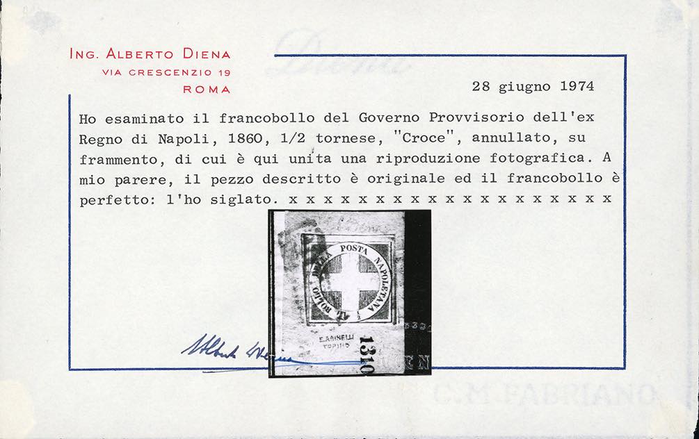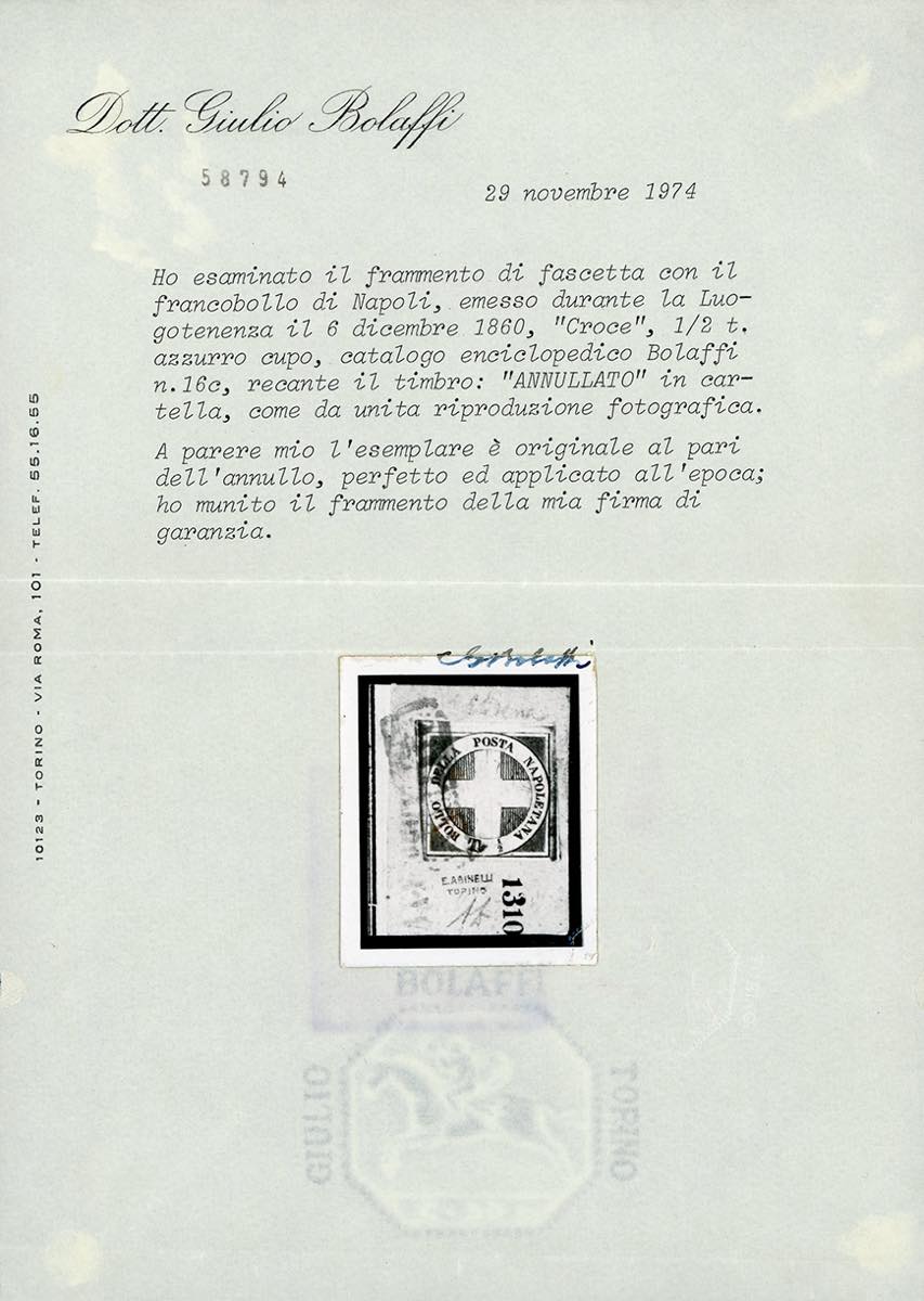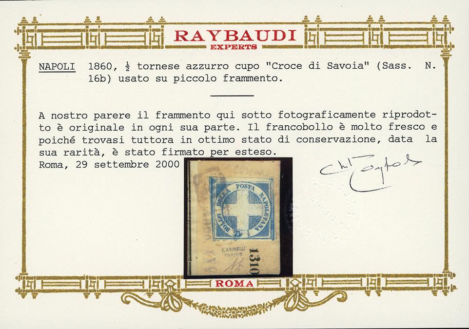 1860 - 1/2 tornese azzurro cupo Crocetta (16b), perfetto, usato su piccolo frammento. Em.Diena, cert. G.Bolaffi, A.Diena e Oro Raybaudi.