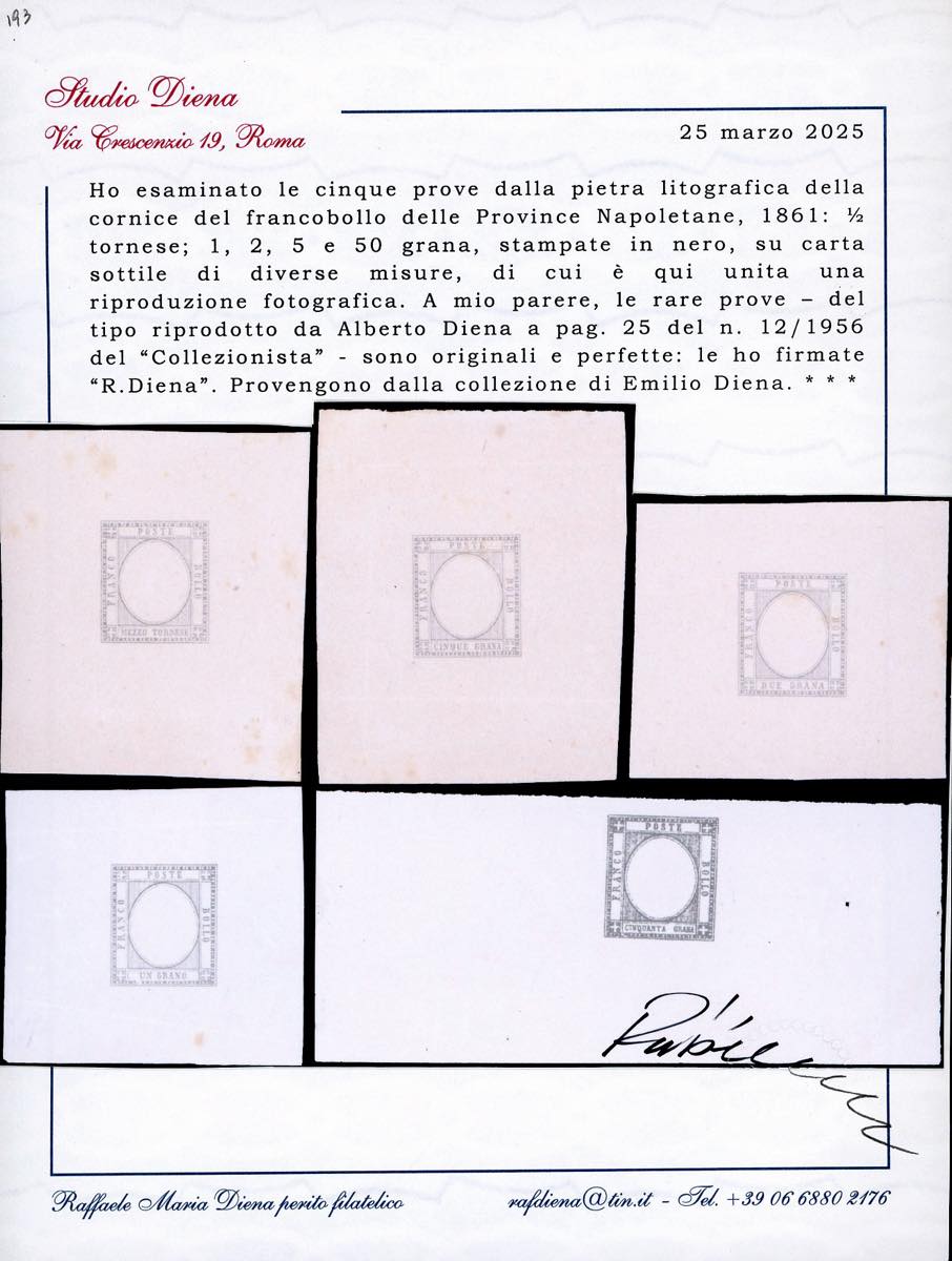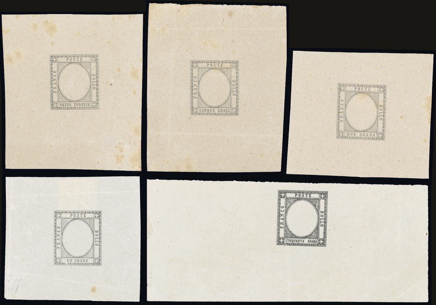 1861 - Prove della pietra in nero con indicazione del valore, cinque esemplari su foglietti di carta sottile, di differenti misure, dei francoblli da 1/2 tornese, 1 grano, 2 grana, 5 grana e 50 grana, senza effigie, senza gomma, ottimo stato. Molto rare. Cert. Diena. Ex coll. Emilio Diena.