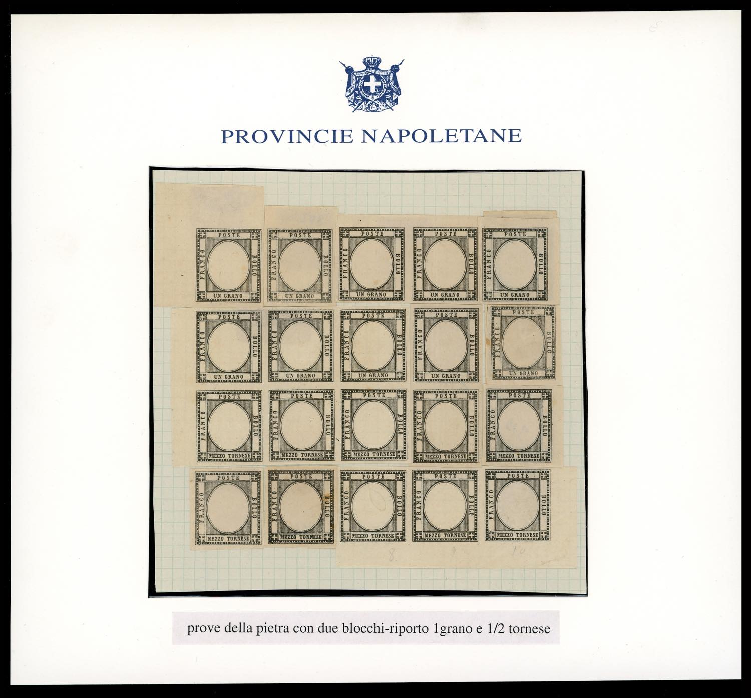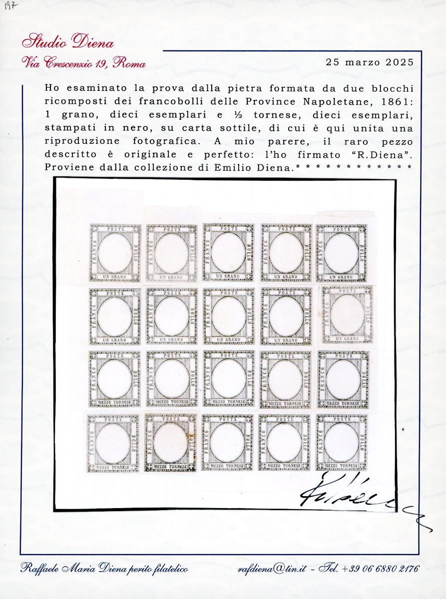 1861 - Prova della pietra in nero con due blocchi-riporto ricomposti, dieci esemplari da 1 grano e dieci da 1/2 tornese, su carta sottile, senza effigie, senza gomma, perfetta. Estremamente rara. Cert. Diena. Ex coll. Emilio Diena.