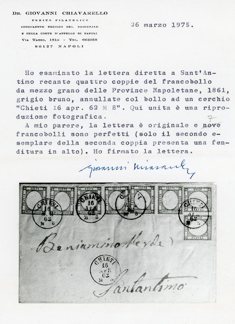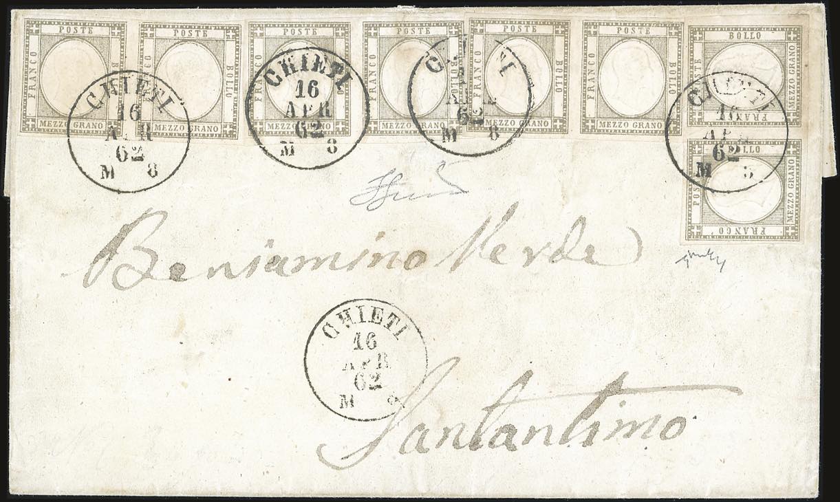 1862 - 1/2 grano grigio bruno (18a), quattro coppie orizzontali perfette, tranne un esemplare con ininfluente difetto in alto, su fresca sovracoperta di lettera da Chieti 16/4/1862 a S.Antimo, bolli d’arrivo. Eccezionale affrancatura multipla monovalore, il secondo massimo multiplo noto di questa tinta. Rarità. Stima di catalogo astronomica. Cert. Chiavarello, Ferrario.