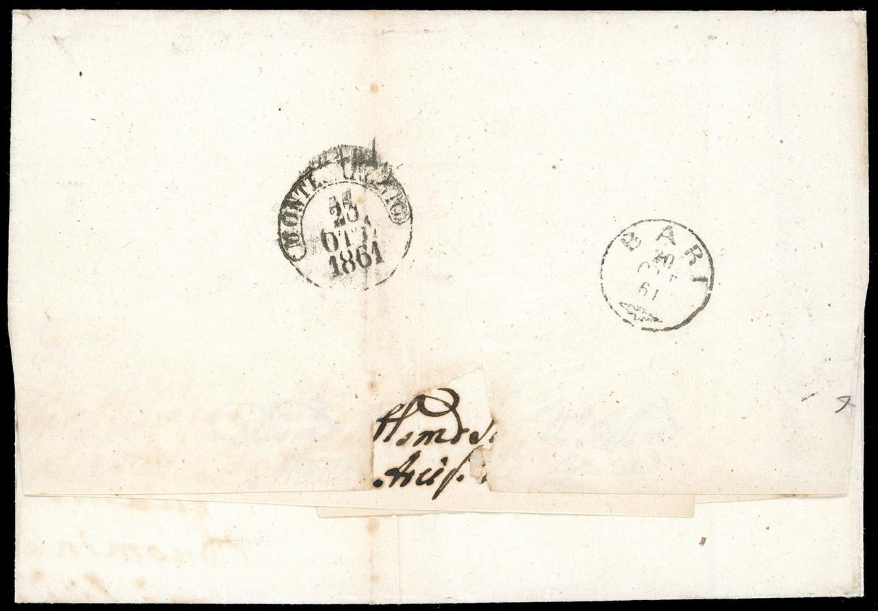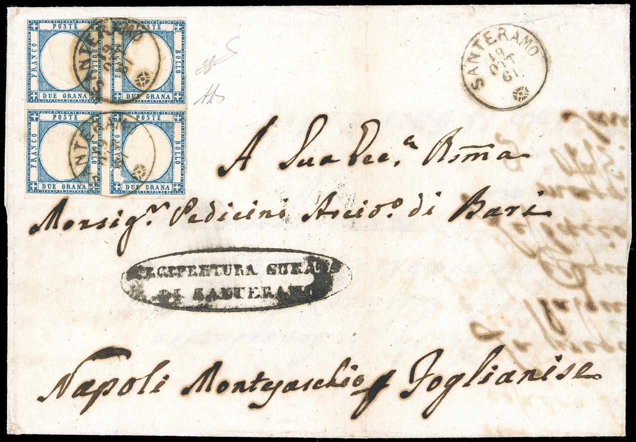 1861 - 2 grana azzurro chiaro (20), blocco di quattro ben marginato, appena sfiorato in un punto in alto a sinistra, su fresca lettera da Santeramo 19/10/1861 a Foglianise. Insieme molto fresco e raro. A.Diena, cert. Ferrario.