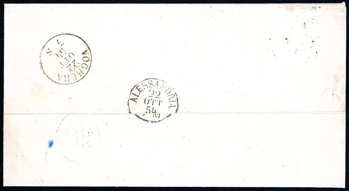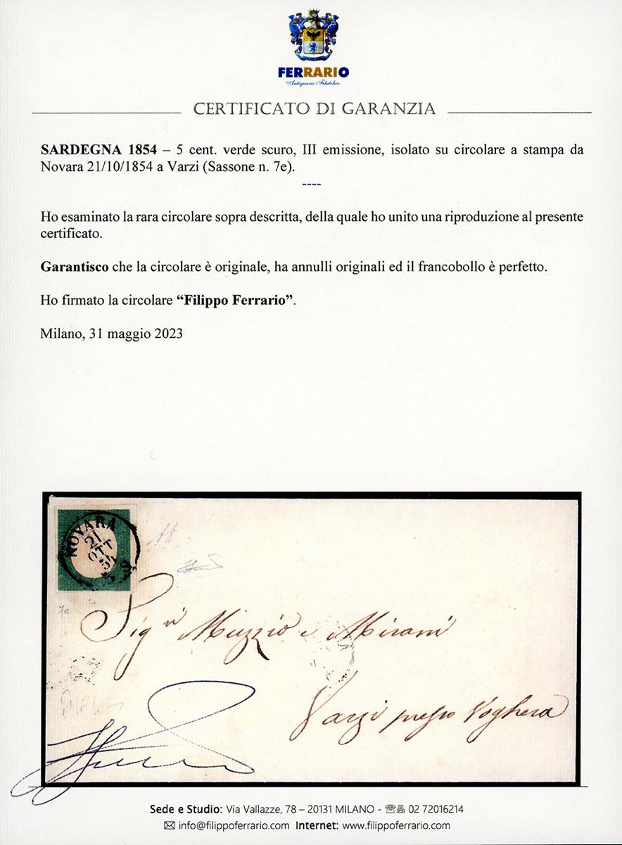 1854 - 5 cent. verde scuro, III emissione (7e), perfetto, isolato su circolare a stampa da Novara 21/10/1854 a Varzi. Pregevole tinta, impreziosita dall'uso isolato. Cert. A.Diena e Ferrario.