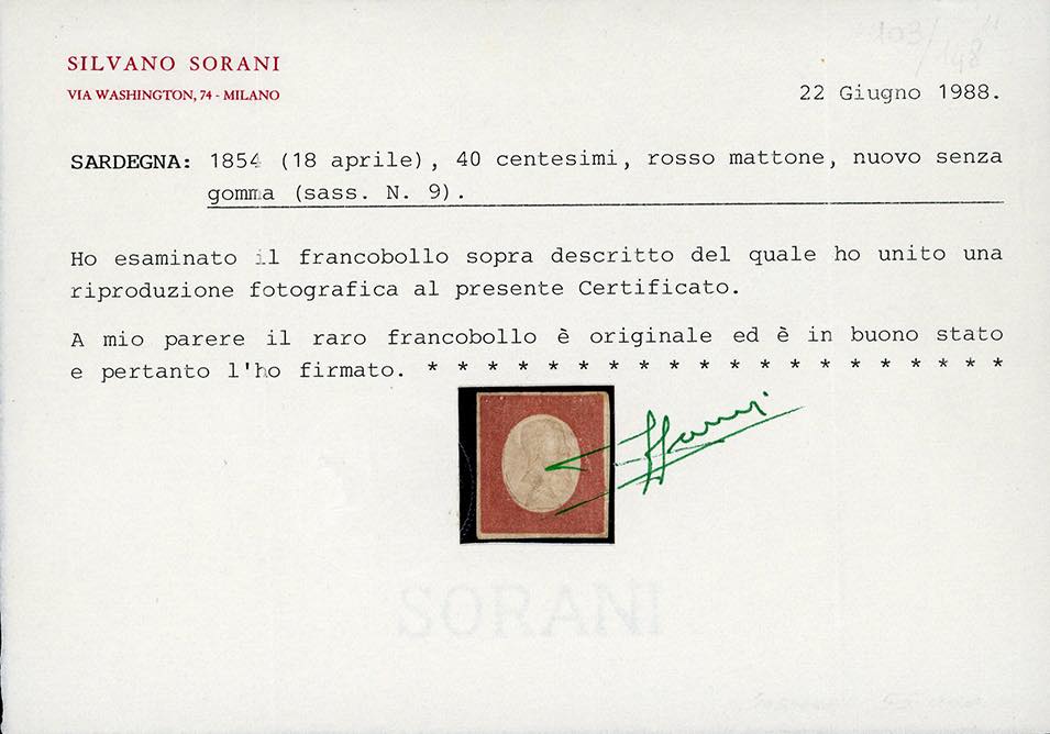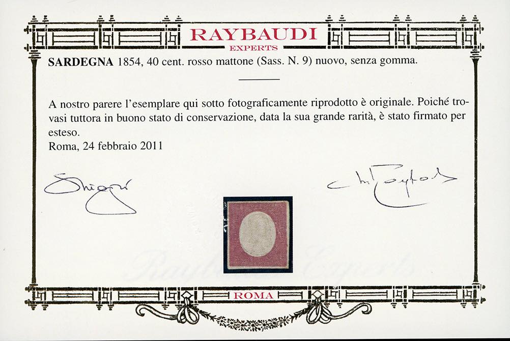 1854 - 40 cent. rosso mattone (9), ampi margini bianchi su tutti i lati, buono stato, nuovo senza gomma. Estremamente raro, pochissimi esemplari nuovi noti. Cert. Sorani e Oro Raybaudi.