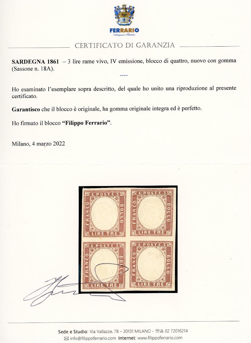 1863 - Quarta emissione, serie completa, tinte più comuni (13E/18A), blocchi di quattro, nuovi, gomma originale integra, perfetti. Bellissimi. G.Bolaffi e cert. Ferrario per il 3 lire.