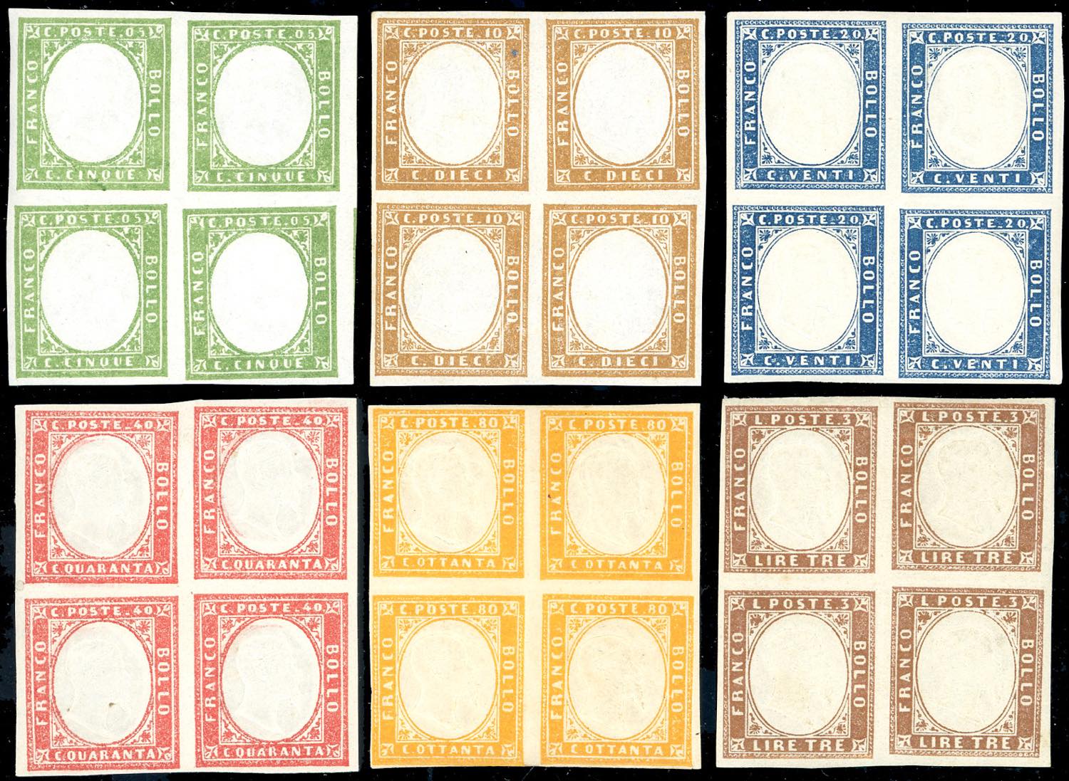 1863 - Quarta emissione, serie completa, tinte più comuni (13E/18A), blocchi di quattro, nuovi, gomma originale integra, perfetti. ... Read more