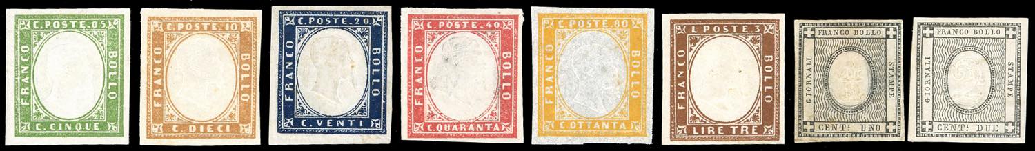 1863 - Quarta emissione, serie tipo nei colori più comuni e centesimi per stampati (13E/18A,19/20), nuovi, gomma originale, perfetti. E.Diena e Ferrario per i due alti valori.
