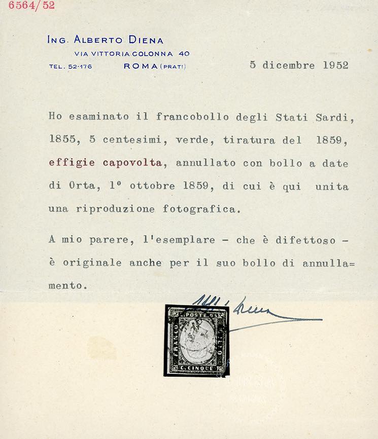 1859 - 5 cent. verde giallo (13Ba), EFFIGIE CAPOVOLTA, leggermente difettoso nell'angolo inferiore destro, usato a Orta 1/10/1859. Molto raro e di ottimo aspetto. Cert. A.Diena e Raybaudi.