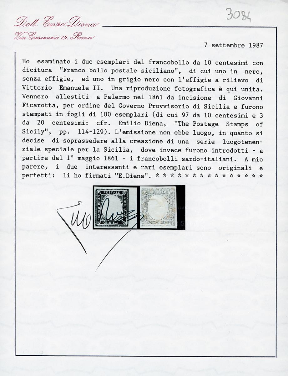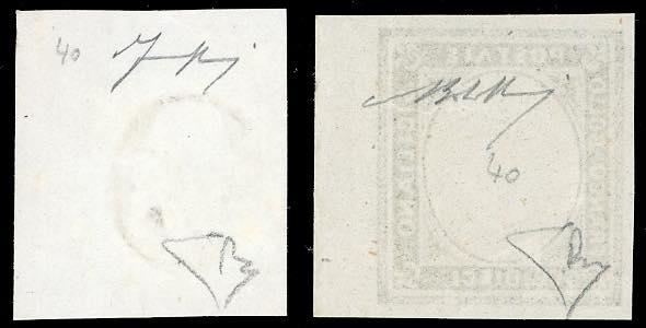 SAGGI 1860 - Saggi Ficarotta, 10 cent. nero, senza effigie, bordo di foglio, 10 cent. grigio nero, con effigie di Vittorio Emanuele II (P64,P67), entrambi nuovi senza gomma, perfetti e di ottima qualità. Rari. A.Bolaffi, dettagliato cert. E.Diena 1987.