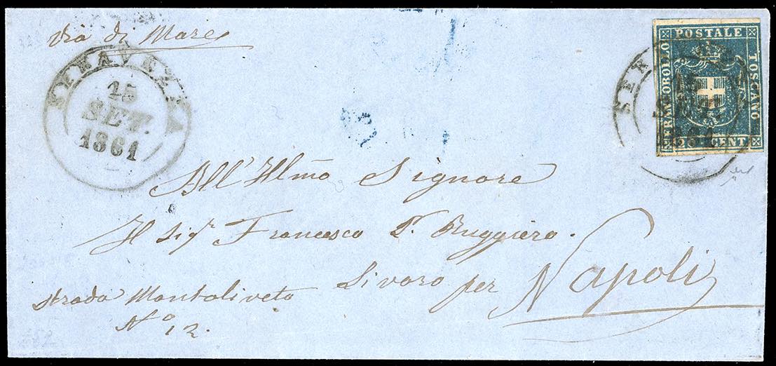 1861 - 20 cent. azzurro (20), ottimo stato, su fresca lettera da Serravezza 15/9/1861 a Napoli, manoscritto "via di mare". Ottimo aspetto. Chiavarello.