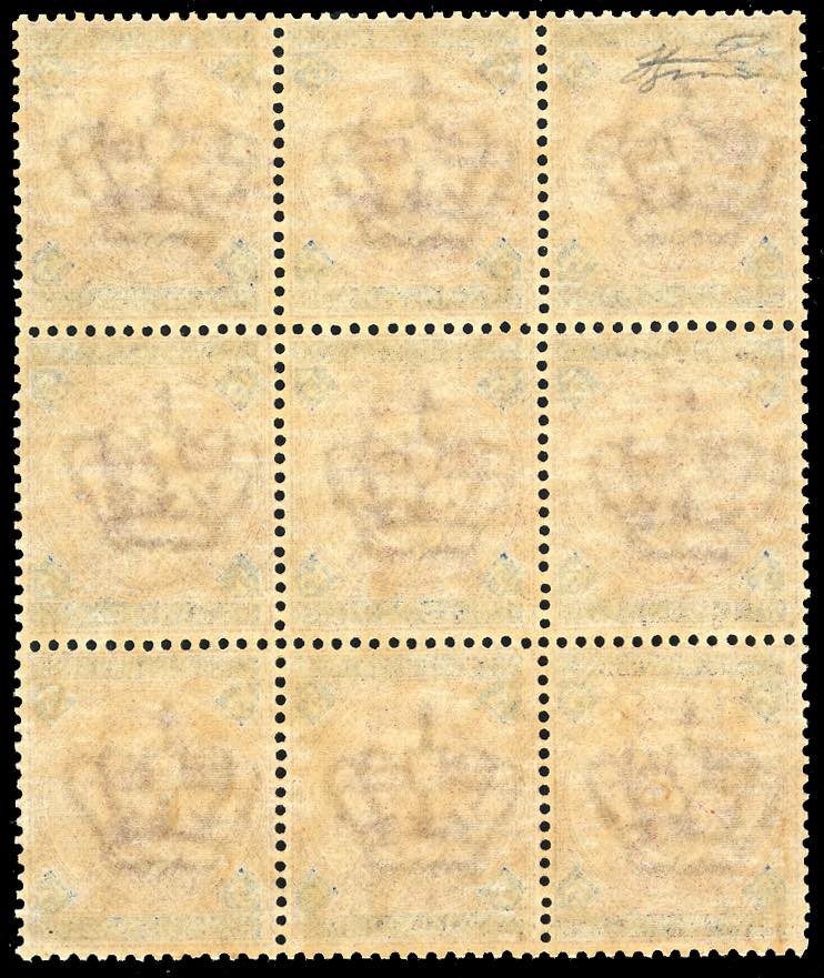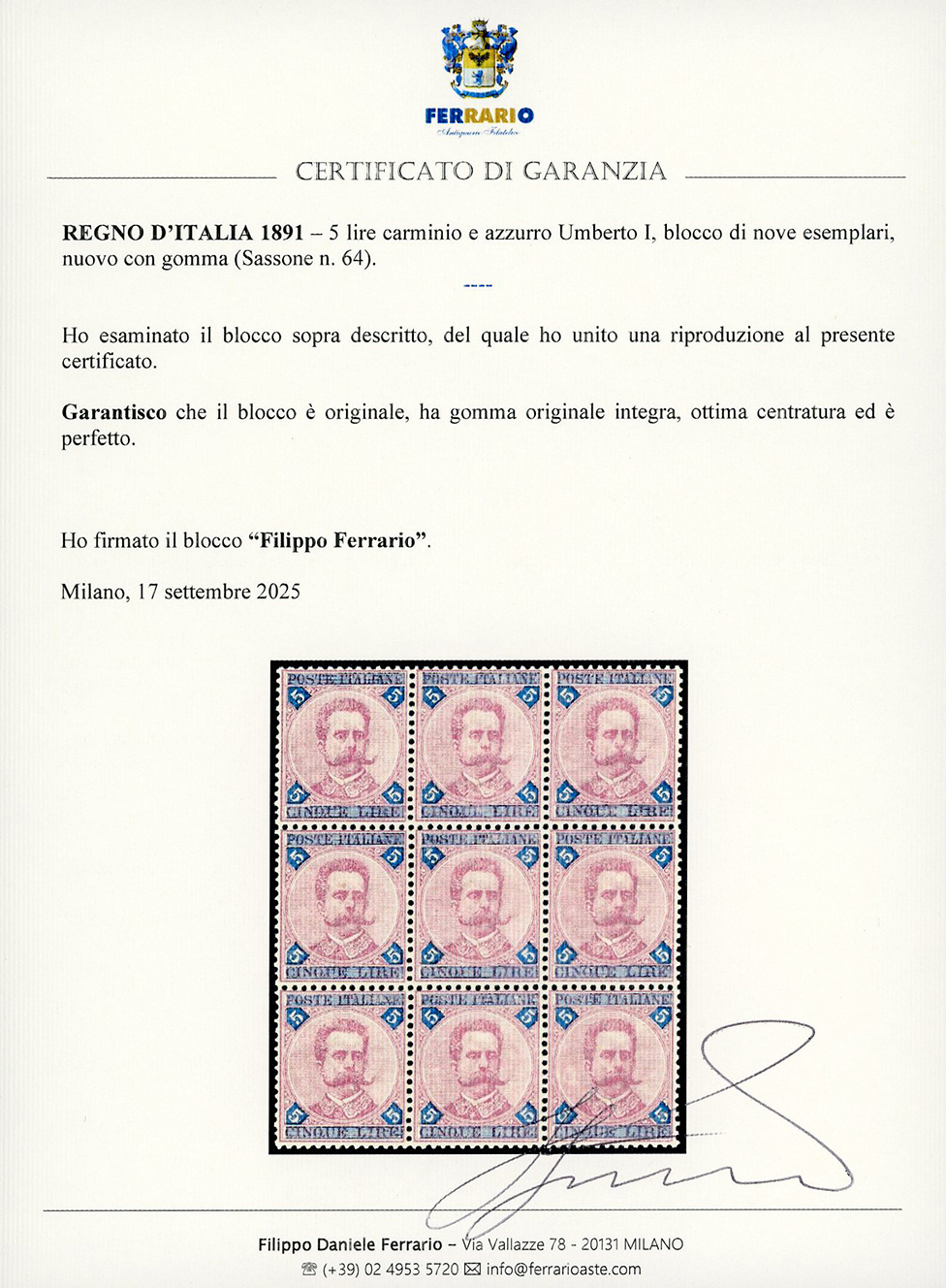 1891 - 5 lire carminio e azzurro Umberto I (64), ben centrato, blocco di nove, nuovo, gomma originale integra, perfetto e molto fresco. Cert. Ferrario.