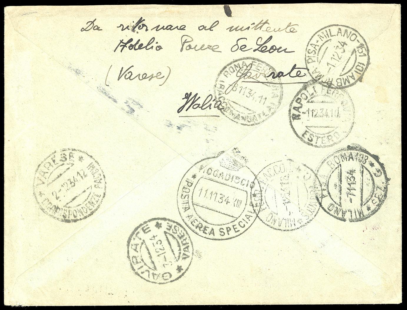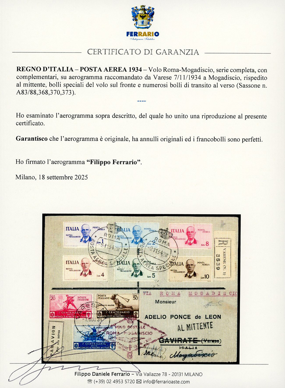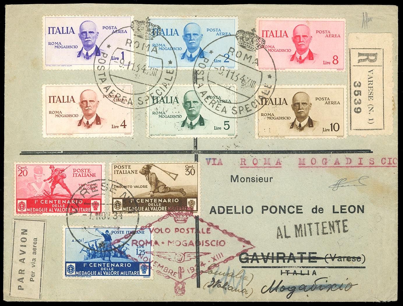 1934 - Volo Roma-Mogadiscio, serie completa, con complementari (A83/88,368,370,373), perfetti, su aerogramma raccomandato da Varese 7/11/1934 a Mogadiscio, rispedito al mittente, bolli speciali del volo sul fronte e numerosi bolli di transito al verso. Cert. Ferrario.