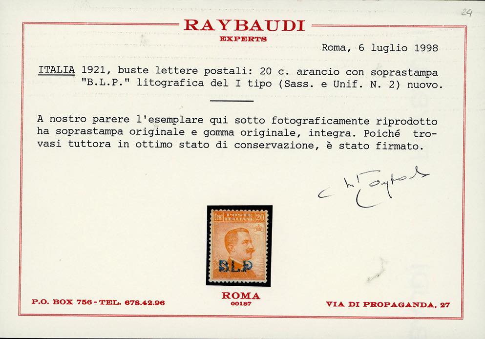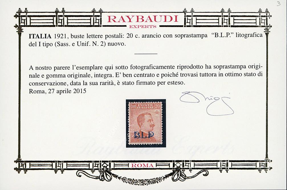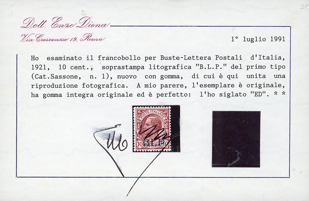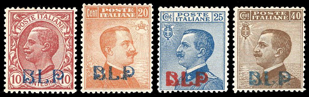1921 - Soprastampati BLP, I tipo, serie completa (1/4), ottima centratura, nuovi, gomma originale integra, perfetti. Molto belli. G.Oliva e cert. E.Diena per il n. 1, Em.Diena e due cert. Raybaudi per il n. 2, E.Diena per il n. 3.