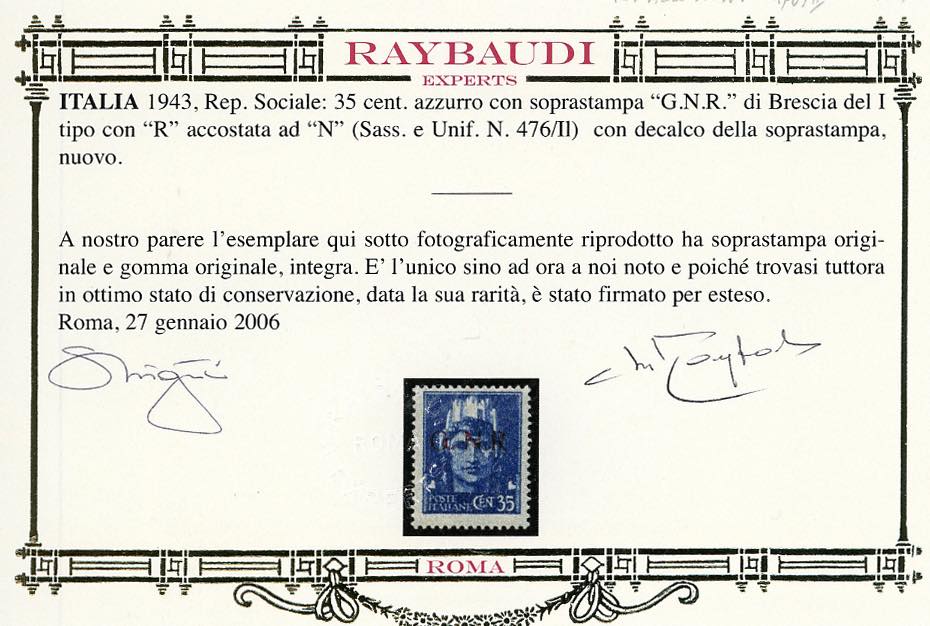 1943 - 35 cent. soprastampa G.N.R. di Brescia, I tipo, R accostata a N e decalco (476/II nota), gomma originale integra, perfetto. UNICO ESEMPLARE NOTO con questa varietà. Mezzadri, cert. Oro Raybaudi.