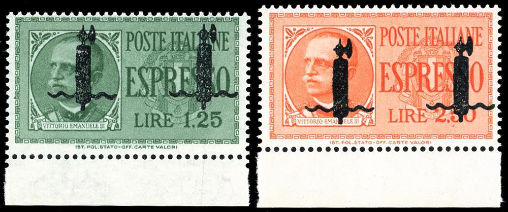 ESPRESSI 1944 - Soprastampati fascio ripetuto in nero di Verona, serie completa (P1/P2), bordo di foglio, perfetti, gomma originale ... Read more