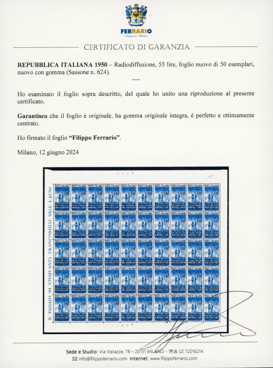 1950 - Radiodiffusione, serie completa (623/624), fogli nuovi di 50 esemplari, gomma originale integra, perfetti. Il 55 lire ottimamente ... Read more