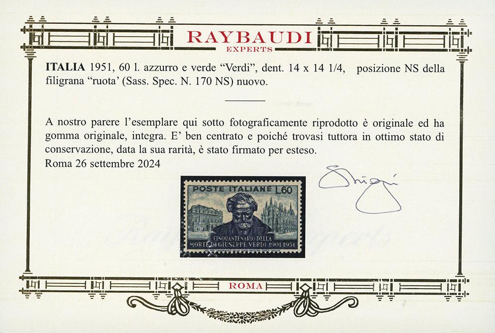 1952 - 60 lire Verdi, denti. 14 x 14 1/4, filigrana ruota in posizione NS (Sass.Spec.170 NS), nuovo, gomma originale integra, perfetto e ben centrato. Splendido e molto raro. Cert. Oro Raybaudi.