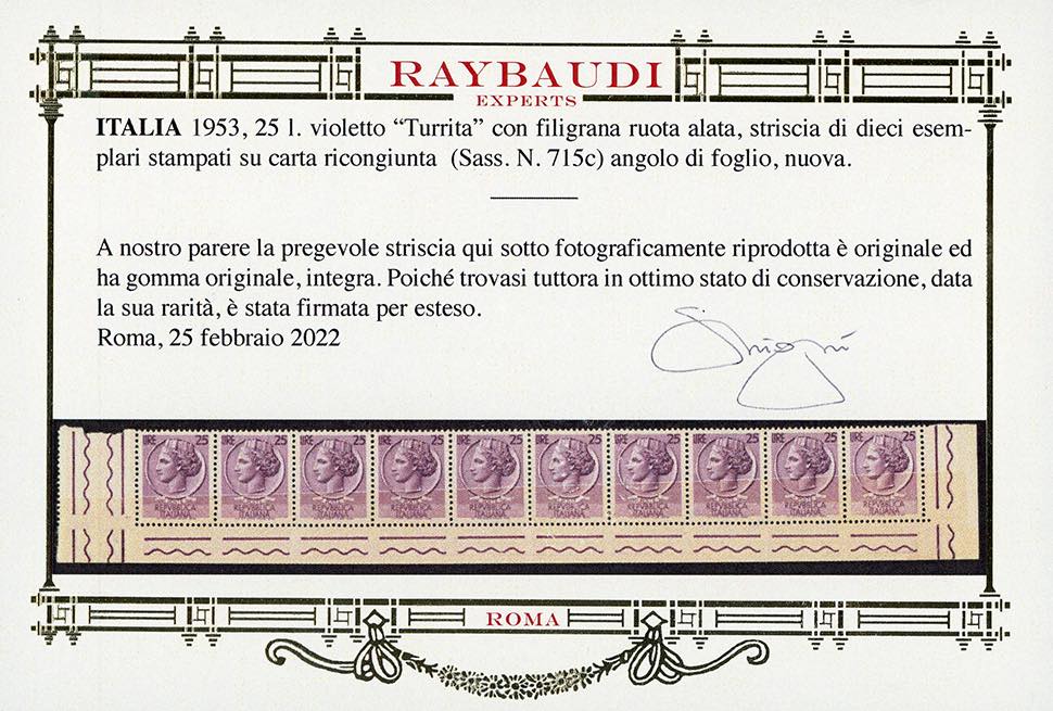 1953 - 25 lire Siracusana, filigrana ruota, stampa su carta ricongiunta (715c), striscia orizzontale di 10 esemplari, angolo di foglio, gomma originale integra, perfetta. Rara. Cert. Oro Raybaudi.