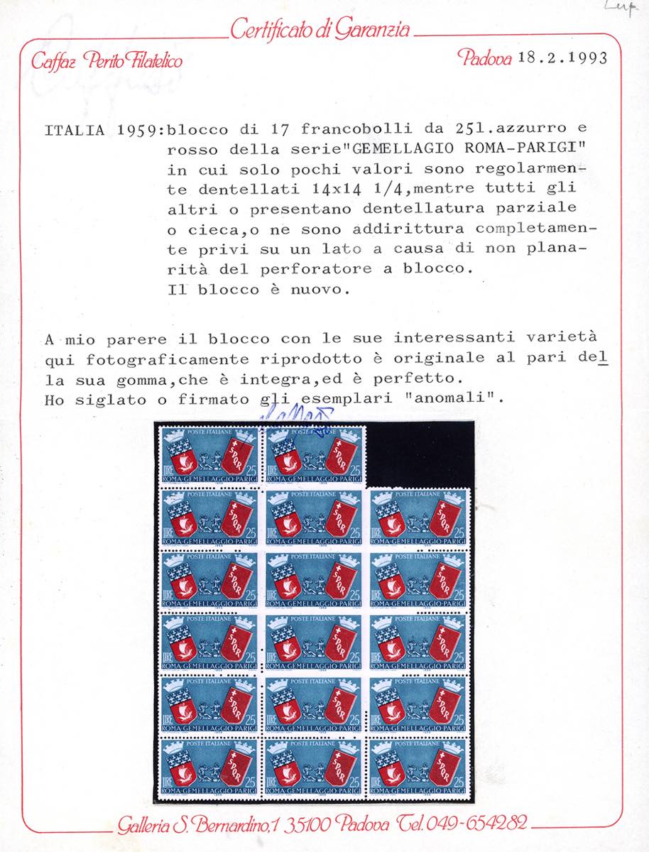 1959 - 25 lire Roma-Parigi, blocco di 17 esemplari, undici esemplari con varietà di dentellatura parziale o cieca, che hanno dato origine a due coppie orizzontali non dentellate al centro (857a), gomma originale integra, perfetto. Molto raro e di ottima qualità. Caffaz e Ferrario.