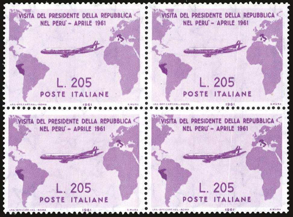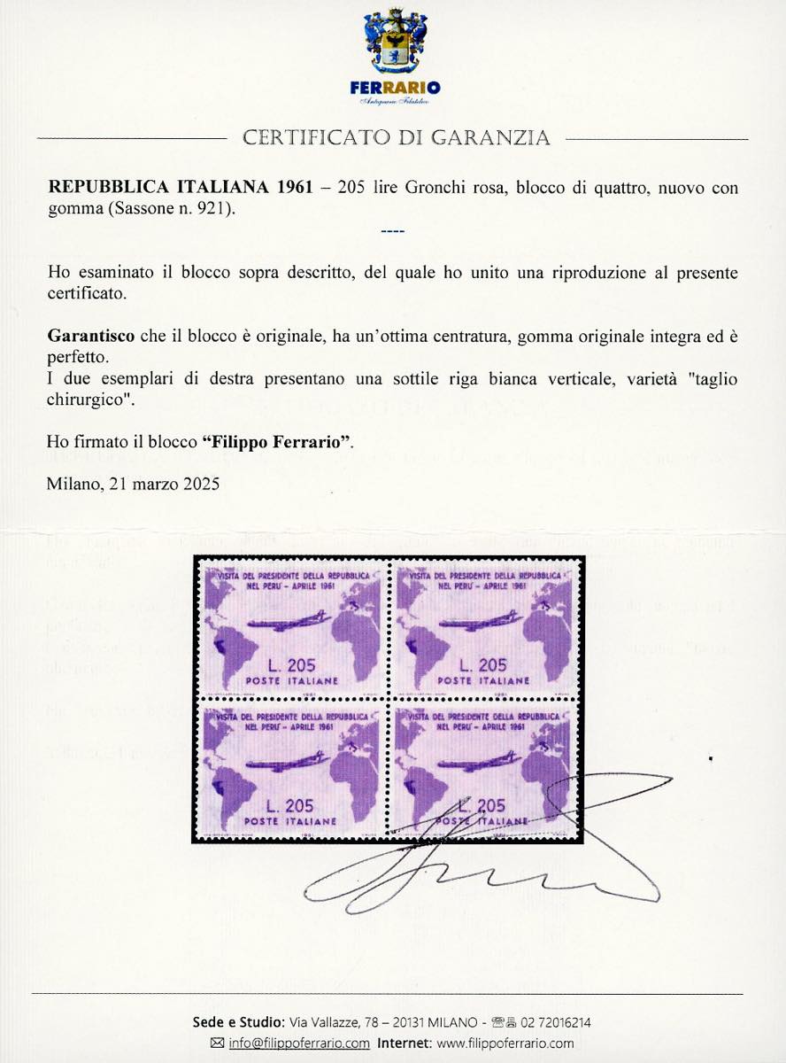 1961 - 205 lire Gronchi rosa (921), blocco di quattro, nuovo, gomma originale integra, perfetto. Molto fresco. I due esemplari di destra presentano una sottile riga bianca verticale, varietà "taglio chirurgico". Insieme raro. Cert. Ferrario.