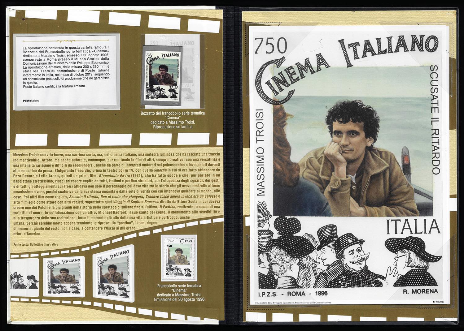 FOLDER 2019 - Folder Massimo Troisi, 750 lire (2233), contenente la riproduzione del bozzetto originale, il francobollo e la sua riproduzione su lamina d'argento, perfetto. Questo raro insieme ha avuto una tiratura di soli 350 esemplari. Cert. Ferrario.