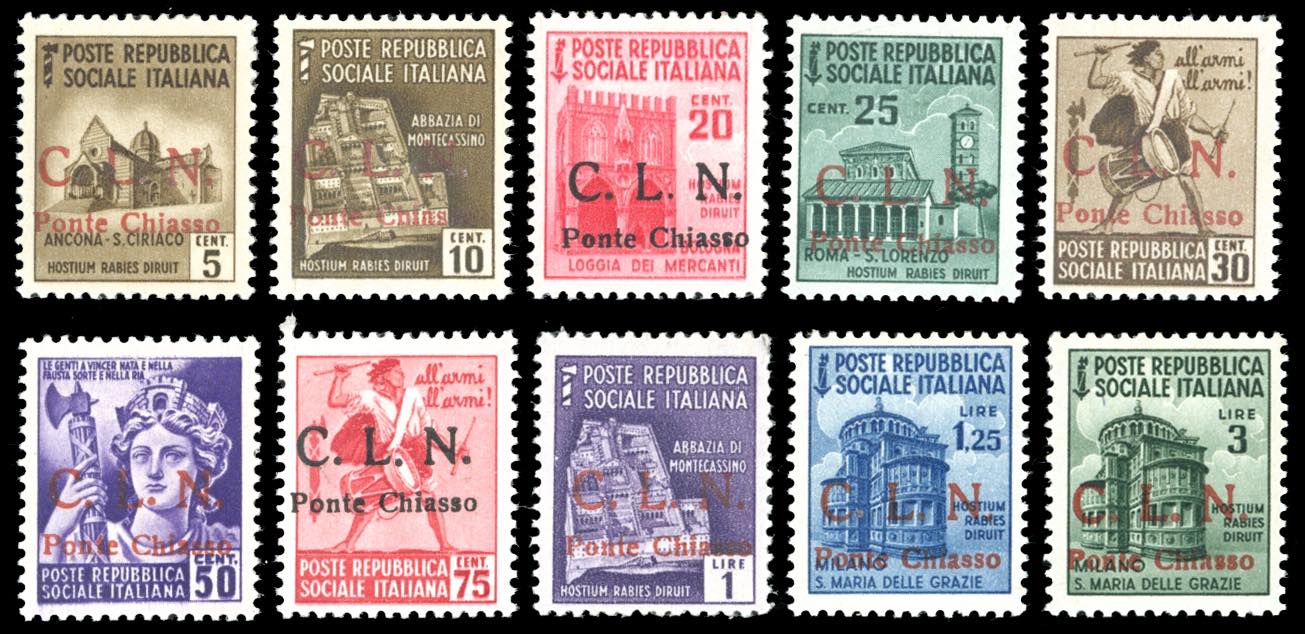 PONTE CHIASSO 1945 - Soprastampati, serie completa (1/10), gomma originale integra, perfetti. Rari, tiratura 100 serie. Cert. Oro Raybaudi.