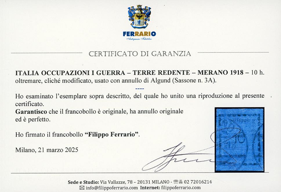 MERANO 1918 - 10 h. oltremare, clichè modificato (3A), usato con annullo di Algund, perfetto. Raro. A.Diena, cert. Ferrario.
