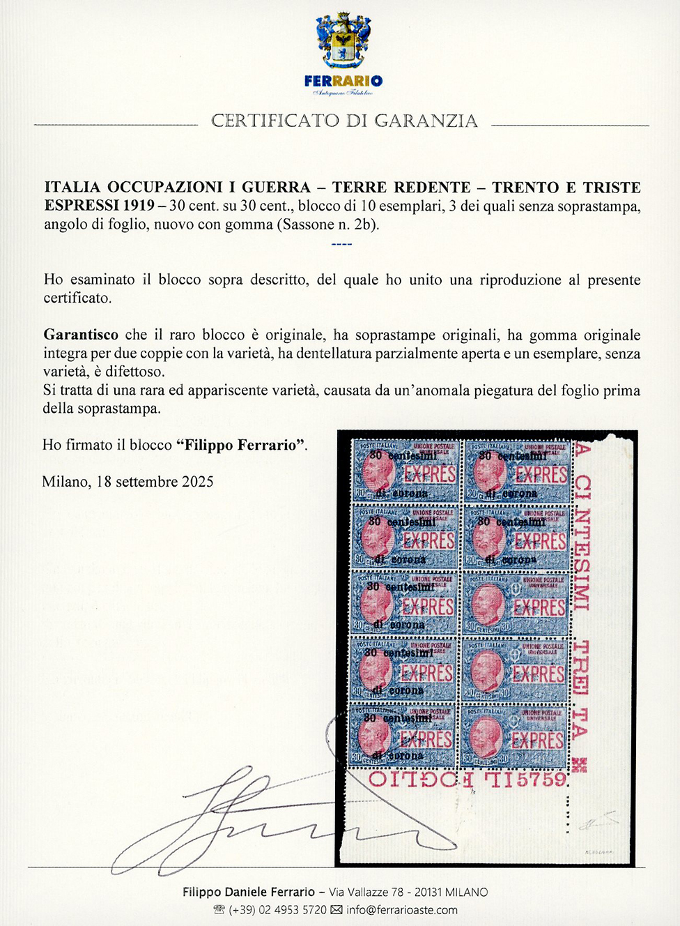 TRENTO E TRIESTE ESPRESSI 1919 - 30 cent. su 30 cent., blocco di 10 esemplari, 3 dei quali senza soprastampa (2b), angolo di foglio, nuovo, gomma originale, integra per due coppie con la varietà, perfetto, dentellatura parzialmente aperta, solo un esemplare, senza varietà, difettoso. Rara ed appariscente varietà, causata da un anomala piegatura del foglio prima della soprastampa. Ferrario.