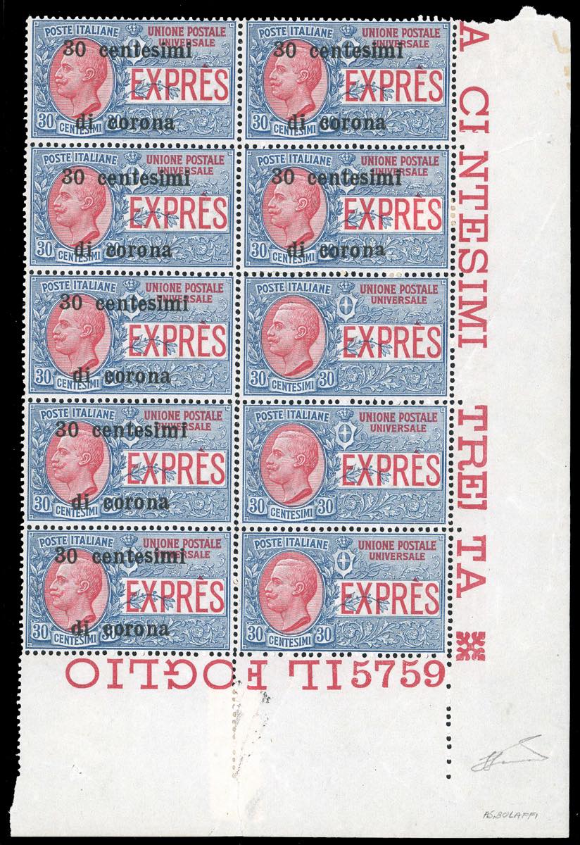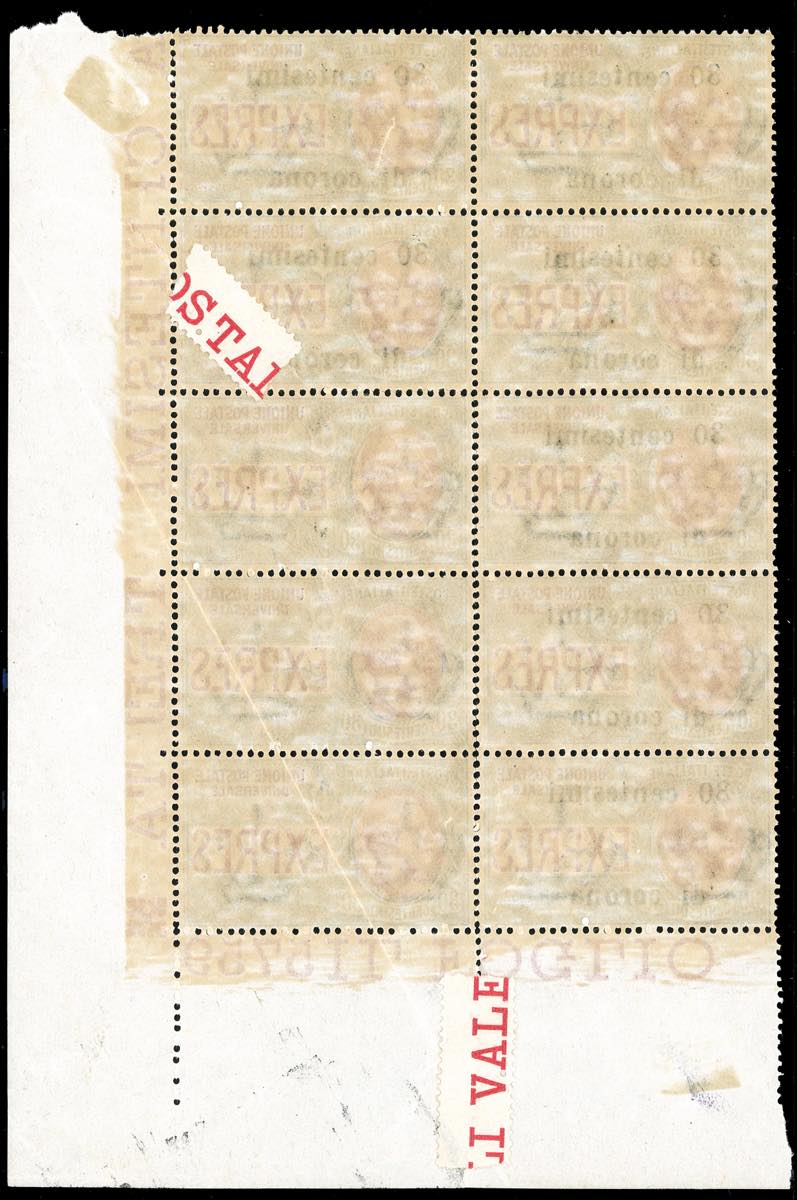 TRENTO E TRIESTE ESPRESSI 1919 - 30 cent. su 30 cent., blocco di 10 esemplari, 3 dei quali senza soprastampa (2b), angolo di foglio, nuovo, ... Read more