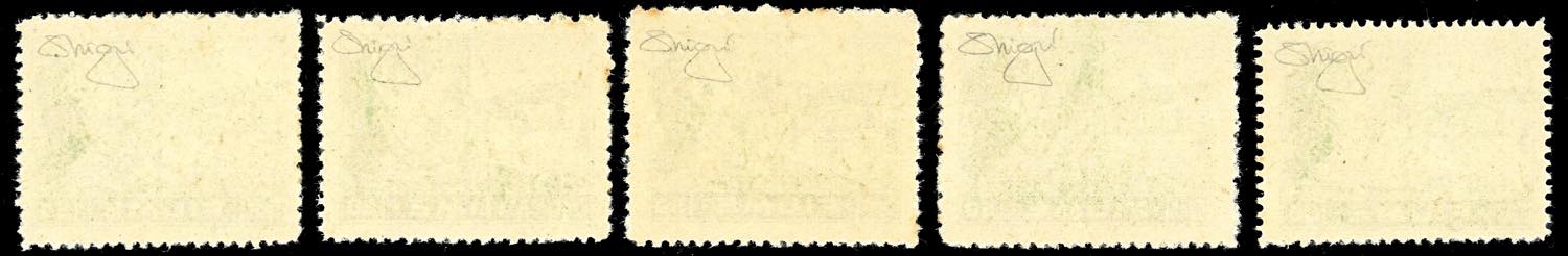 FIUME 1919 - 50 cent. Allegoria, carta C (C42), cinque esemplari rispettivamente dentellati: 12 3/4 in basso e 13 sugli altri lati; 13 su tutti i lati; 12 3/4 in basso e 12 1/2 sugli altri lati; 12 1/2 x 13; 13 x 12 1/2. Tutti nuovi, gomma originale integra, perfetti. L'unica variante di dentellatura già catalogata è la seconda, C42/II € 10.000. Insieme rarissimo e di grande interesse, per specialista. Cinque cert. Raybaudi.
