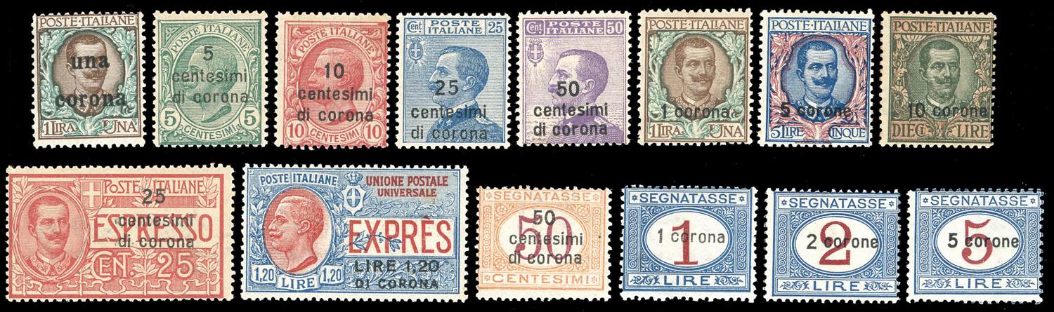 DALMAZIA 1919/22 - Giro completo delle emissioni di posta ordinaria e servizi (1,2/8,E1/1,T1/4), nuovi, gomma originale integra, perfetti e molto freschi. Alti valori firmati Ferrario.