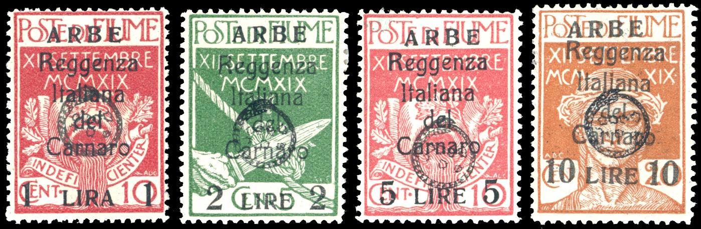 ARBE 1920 - 1 lira su 10 cent., 2 lire su 5 cent., 5 lire su 10 cent., 10 lire su 20 cent. soprastampati "Reggenza Italiana del Carnaro", soprastampati "Arbe" in caratteri piccoli, emblema della Reggenza sia al recto che al verso (Sass.nota), nuovi, gomma originale, perfetti. Molto rari, malgardo siano stati emessi senza carattere di ufficialità.