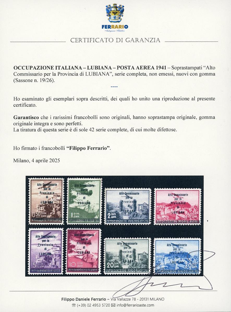 LUBIANA POSTA AEREA 1941 - Soprastampati "Alto Commissario", non emessi, serie completa (19/26), nuovi, gomma originale integra, perfetti. Molto rari, solo 42 serie complete note, molte delle quali senza gomma o difettose. A.Diena, Fiecchi, cert. Ferrario e Diena.