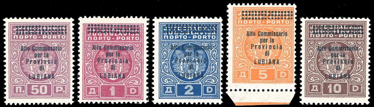 LUBIANA SEGNATASSE 1941 - Soprastampati "Alto Commisario", non emessi, serie completa (16/20), nuovi, gomma originale integra, perfetti. Molto rari, solo 42 serie complete note, molte delle quali senza gomma o difettose. Cert. A.Diena e Ferrario.