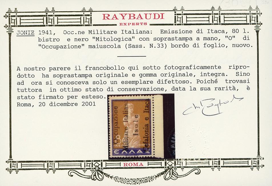 CEFALONIA E ITACA-EMISSIONI DI ITACA 1941 - 80 l. Mitologica, soprastampa a mano, "O" di "Occupazione" maiuscola (33), bordo di foglio nuovo, gomma originale integra, ottimo stato. Dal cert. Oro Raybaudi del 2001: " sino ad ora si conosceva solo un esemplare difettoso". Rarità del settore.