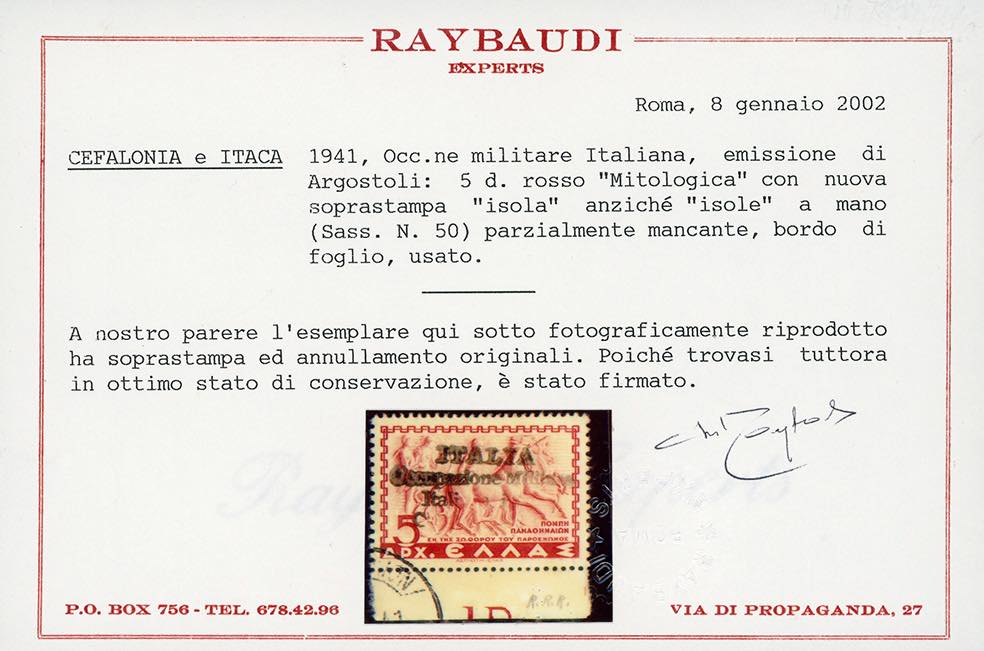 CEFALONIA E ITACA-EMISSIONI DI ARGOSTOLI 1941 - 5 d. Mitologica, soprastampa a mano "isola" parzialmente mancante (50var), bordo di foglio, usato, perfetto. Varietà molto rara, non catalogata. G.Oliva, cert. Raybaudi.