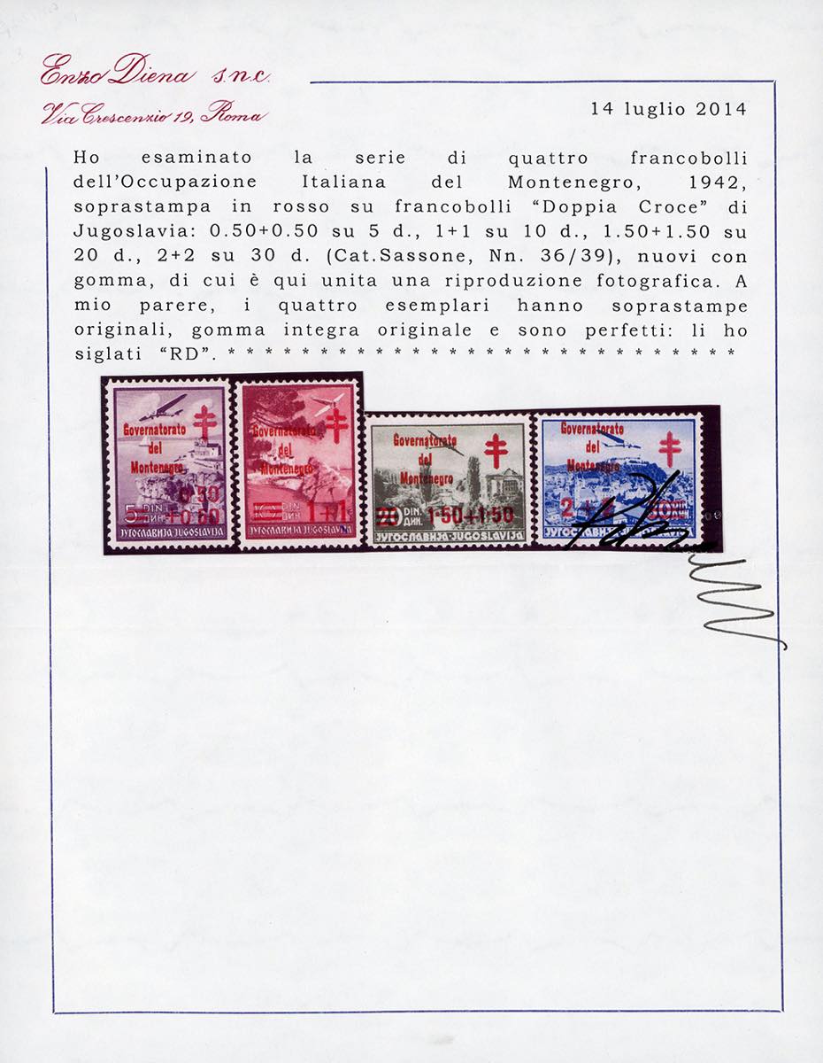 MONTENEGRO 1942 - Croce Rossa, soprastampati in rosso, serie completa (36/39), nuovi, gomma originale integra, perfetti. Rari, tiratura 200 seire. Cert. Alberto e Raffaele Diena.
