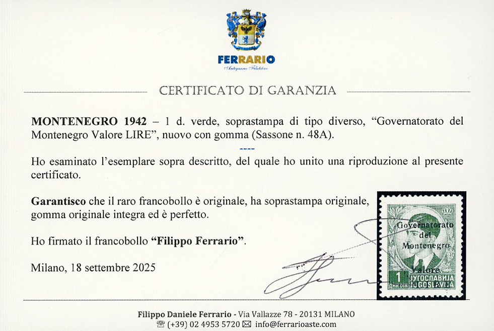 MONTENEGRO 1942 - 1 din. verde, soprastampa di tipo diverso (48A), nuovo, gomma originale integra, perfetto e di ottima qualità. Molto raro, pochissimi esemplari noti. Avi, cert. Oro Raybaudi e Ferrario.