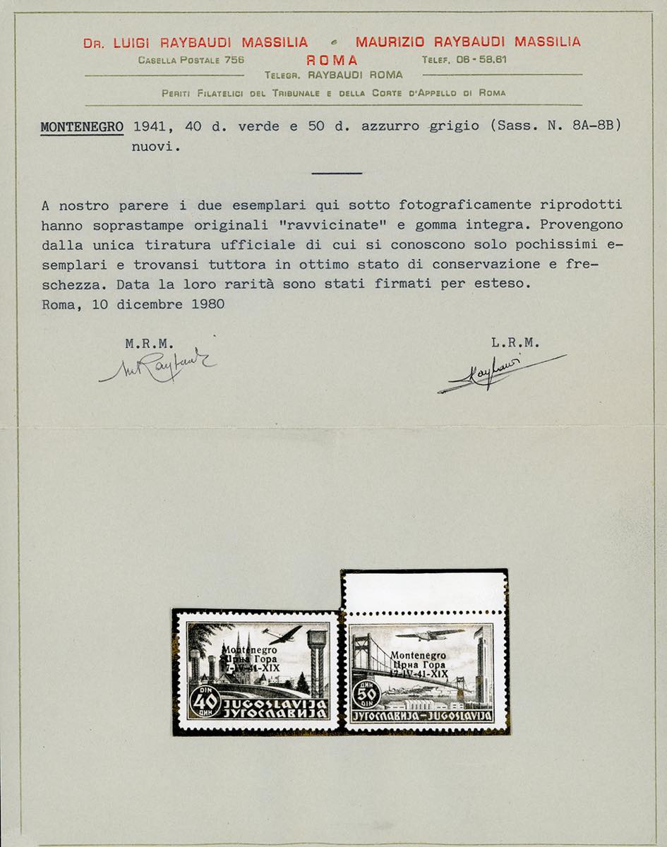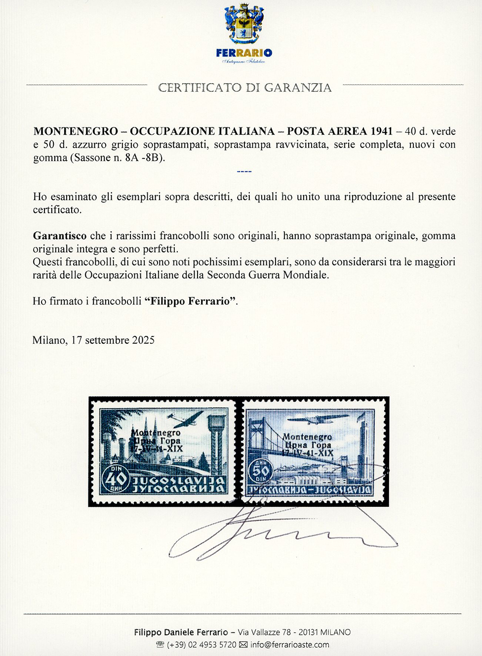 MONTENEGRO POSTA AEREA 1941 - 40 d. e 50 d. soprastampati, soprastampa ravvicinata, serie completa (8A/8B), nuovi, gomma originale integra, perfetti. Estremamente rari, pochissimi esemplari noti. Cert. E.Diena e L.Raybaudi per il n. 8A, cert. Oro Raybaudi e Ferrario per la serie.