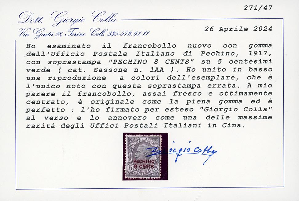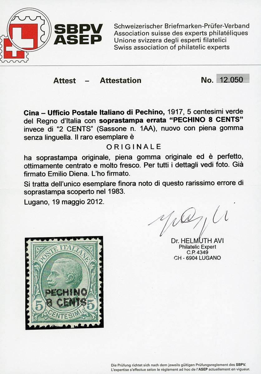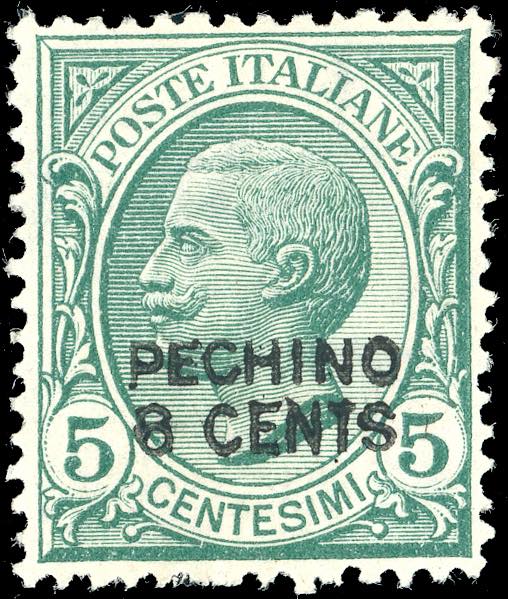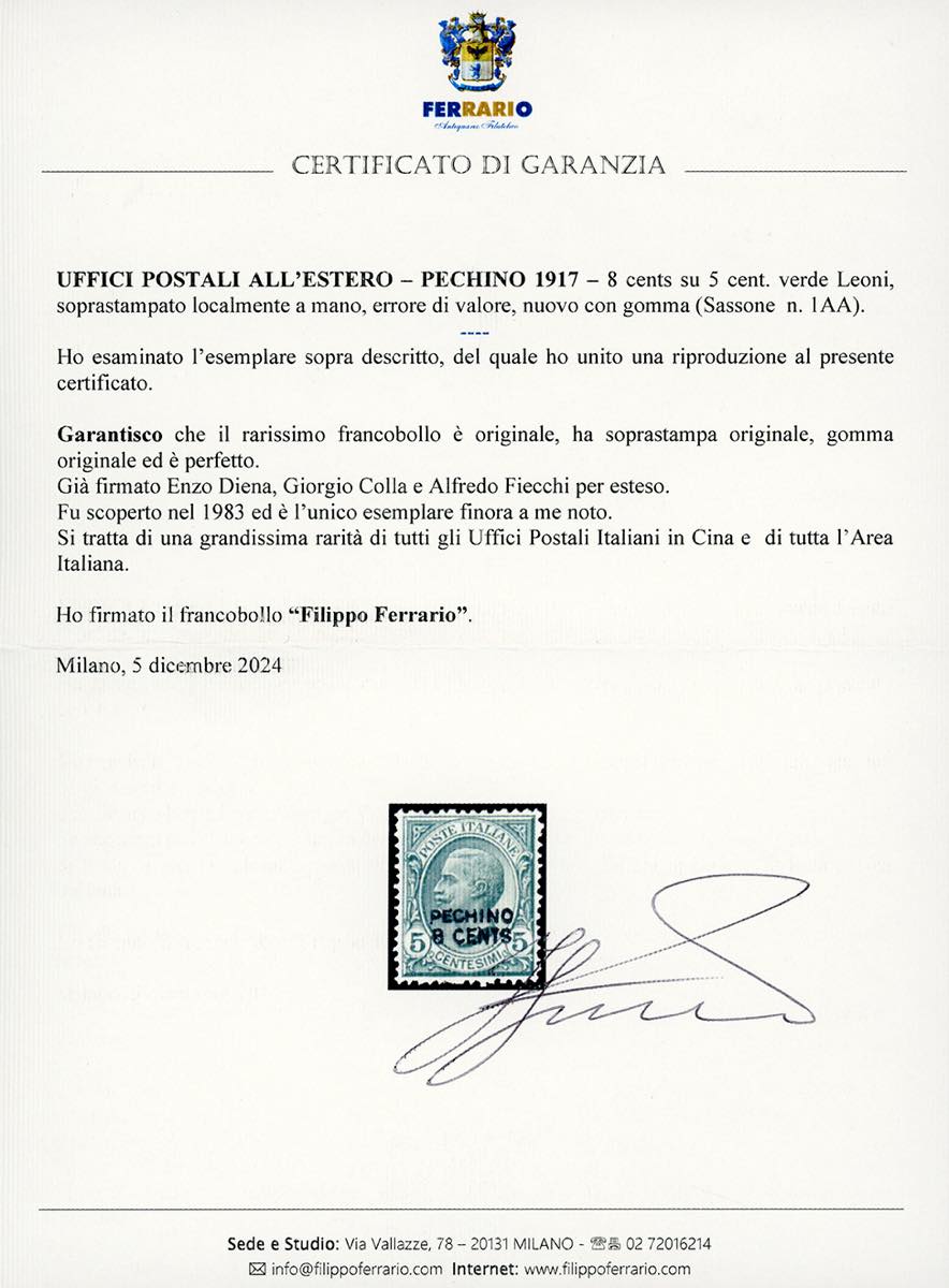 PECHINO 1917 - 8 cents su 5 cent. Leoni, soprastampato localmente a mano, ERRORE DI VALORE (1AA), nuovo, gomma originale, leggerissima traccia di linguella, perfetto. Questo francobollo venne scoperto nel 1983 ed è l'UNICO ESEMPLARE NOTO. E' da annoverarsi tra le massime rarità degli Uffici Postali Italiani in Cina, nonché di tutta l'Area Italiana. Enzo Diena, Fiecchi, cert. Colla, Avi e Ferrario.