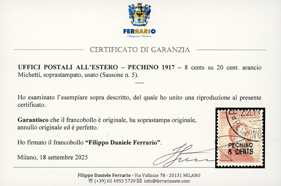 PECHINO 1917 - 8 cent. su 20 cent. Michetti soprastampato (5), usato, perfetto. Raro. Cert. Ferrario.