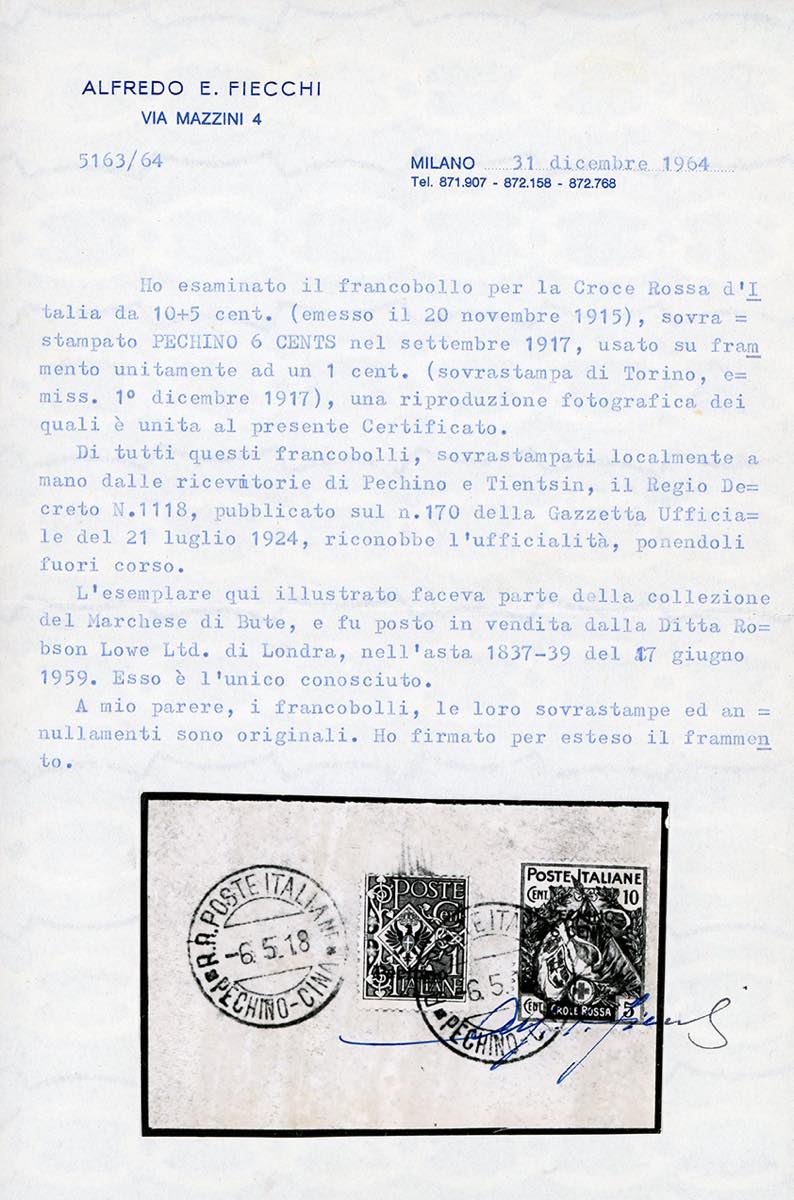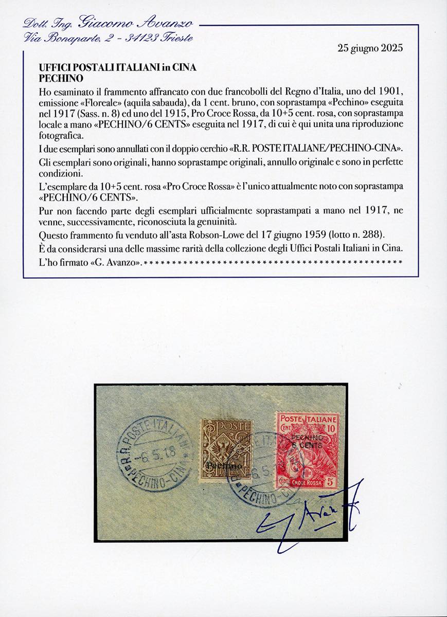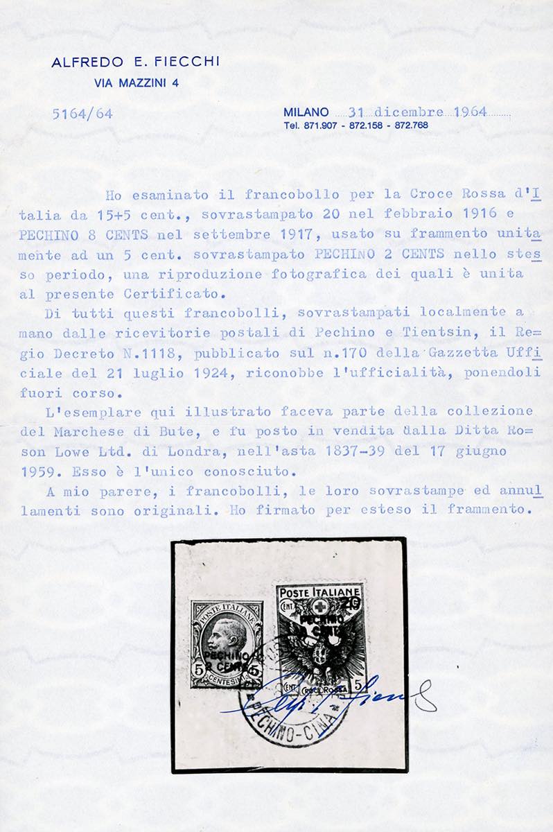 PECHINO 1917 - 6 cents su 10 + 5 cent. Croce Rossa, 1 cent. soprastampato a macchina (8), e 8 cents su 20 cent. su 15 + 5 cent. Croce Rossa, 2 cents su 5 cent. Leoni soprastampato localmente a mano (1), perfetti, usati su due frammenti a Pechino 6/5/1918. Pur non facendo parte degli esemplari ufficialmente soprastampati a mano nel 1917, il Regio Decreto n. 1118 del 21/7/1924 ne riconobbe la genuità e l'ufficialità, ponedoli fuori corso. Entrambi i frammenti facevano parte della collezione del Marchese di Bute, venduta all'asta Robson Lowe del 17/6/1959. I due esemplari Croce Rossa sono GLI UNICI NOTI e sono da annoverarsi tra le massime rarità degli Uffici Postali Italiani in Cina, nonché di tutta l'Area Italiana. Cert. Fiecchi ed Avanzo.